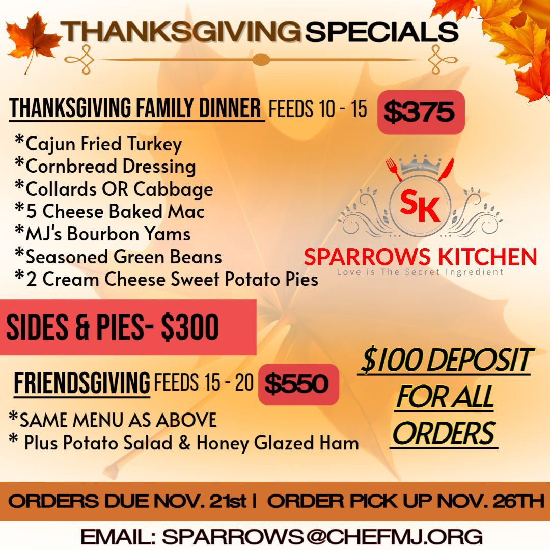 Chef MJ is a Personal/Private Chef serving the Metro Atlanta Area. He is the owner & Head Chef of Sparrows Kitchen where Love is our special ingredient. Simply put our specialization is Comfort Foods for the Soul. At Sparrows Kitchen we offer a wide range of services including Pop-Up Events, Catering, Cooking Classes, Meal Prep, Private Dinners, Lunch Meals & More. We believe that good food can change a persons mood and bring joy into their day. Let us bring our Kitchen to you and give you the Sparrows Experience.